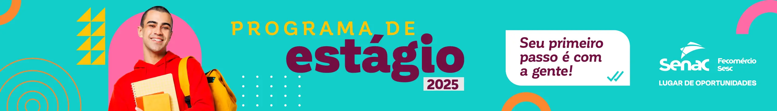 Em continuidade ao compromisso do Senac de oferecer educação de excelência, o Programa de Estágio é a oportunidade ideal de aliar a teoria e a prática, e fortalecer valores que fazem parte do DNA da instituição, propiciando aos estudantes competências voltadas à profissionalização e à cidadania.
